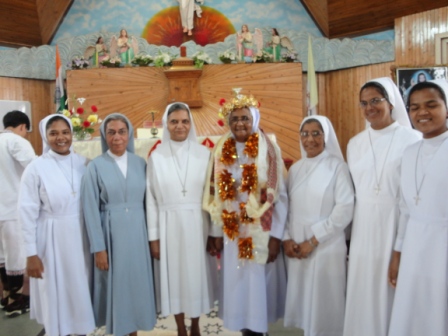 Golden Jubilee of Sr. Anna Varkey was celebrated with great preparation and solemnity on 3rd August 2014 at Don Bosco Parish, Mirik. The Holy Mass was at 9.30 a.m., presided over by Rev. Fr. Fabianus Kujur the parish priest and Fr. Raymond Tudu the assistant parish priest. The Holy Mass began with the entrance dance by the boarders. During the homily the celebrant congratulated Sr. Anna and spoke of the faithfulness and generosity of God towards us. The liturgy was animated by the parishioners. After the Holy Mass Sr. Anna spoke few words to all those who were present quoting the Psalm 16:9 “I am thankful and glad, and I feel completely secure, because you protect me from the power of death. I have served you faithfully and you will not abandon me to the world of the dead.” I am feeling very happy and contended. I never thought that I will be celebrating my Golden Jubilee. But it is God, who makes everything wonderful in our life, she said. It was followed by cutting of the cake and felicitation. The three neighbouring communities Jaigaon, Kurseong and New Chumta represented the whole province.