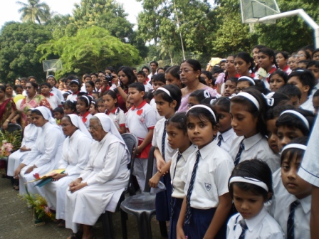 Auxilium Convent School Barasat had the sublime experience of inaugurating the Bicentenary year of Don Bosco’s birth on 22nd August 2014. It was celebrated as the Auxilium family: the school and DB tech students honoured their father solemnly. The program was organized by the Bosco house. It started at 8.15 am with escorting the portrait of Don Bosco from sisters’ residents. Sisters accompanied the portrait as the Bosco House marched in unison towards the school. Then the portrait was placed in a prominent place and garlanded, followed by lighting the lamp and hoisting the bi-centenary flag. The unveiling of collage and displaying of flex revealed Don Bosco’s service to the youth for two centuries. Rev. Sr. Stella gave meaningful message; once again reminding the three years preparation and inviting to imitate Don Bosco and make oneself a beautiful gift for the Lord.The event came to a close by the releasing of 200 balloons and declaration by Rev. Sr. Stella the mega celebrations open. The Bosco house invited the whole school to make promise to make the upcoming year more colourful, joyous and bright by imbibing his spirit and spirituality. The slogan Bosco Bosco filled the air of Auxilium and the symbolic balloons carried the cheers of youngsters to their friend Don Bosco.
