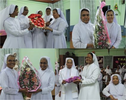 The animators and sisters of INC province congregated in Auxilium Dum on 23rd and 24th June to be part of the twofold celebrations of Thanksgiving to the outgoing Provincial, Sr. Maria Pettayil and the installation of the new Provincial, Sr. Rose Ezarath. The Thanksgiving Celebration was conducted on 23rd June at 6.00 p.m. It commenced with the entrance procession to the hall with lit candles which was placed at the feet of the Blessed Mother who is the directress and inspirer of our Province. The evening prayer prepared by the community of Bandel was a eulogy of gratitude towards Sr. Maria Pettayil who had directed the Province for the past six years with great diligence and spirit of sacrifice. Songs, commentaries, videos was a veritable homage to express gratitude by every person in the Province. The vice provincial Sr. Teresa Adampakallel paid tribute to Sr. Maria in her speech and said that we could not thank her sufficiently . So one and half month of prayer was the only way and it was tabulated and offered in form of a spiritual bouquet was prepared artistically and beautifully in the form of a red heart a symbol of love and gratitude and presented to Maria.