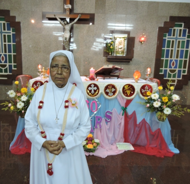 Before the commencement of the Mass a short profile of Sr. Mary George was presented to the assembly. She hails from Ramapuram, Kerala, born to her parents George and Elizabeth on 1st July 1931. Through the instrumentality of her elder brother late Fr. Mathew SDB and her parish priest, Sr. Mary George joined the Daughters of Mary Help of Christians at Vellore in 1946 as an aspirant and made her 1st Profession on 24th May 1955 at Kotagiri. She worked in various capacities in different communities of the 4 provinces of Chennai, Guwahati, Shillong and Kolkata as Provincial bursar, local bursar, animator and formator of candidates. Sr. Mary worked in the communities of New Delhi, Maligaon, Dibrugarh, Nongthymmai, Jumaikela, Dum Dum, Park Circus, Kathmandu (Nepal), Barasat and Ranchi. A good recruiter for vocations, she has enabled many to answer their call generously to the Lord.