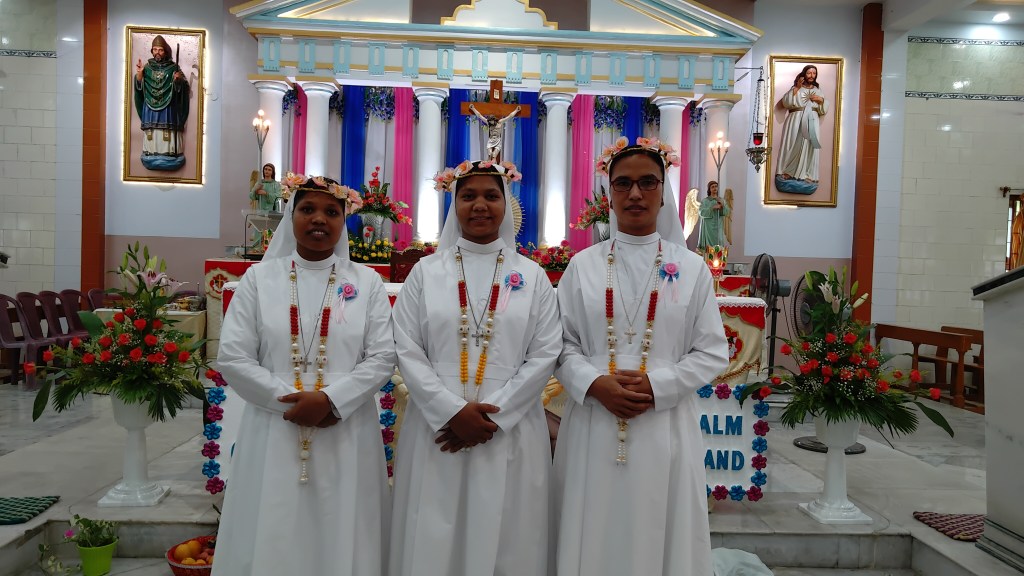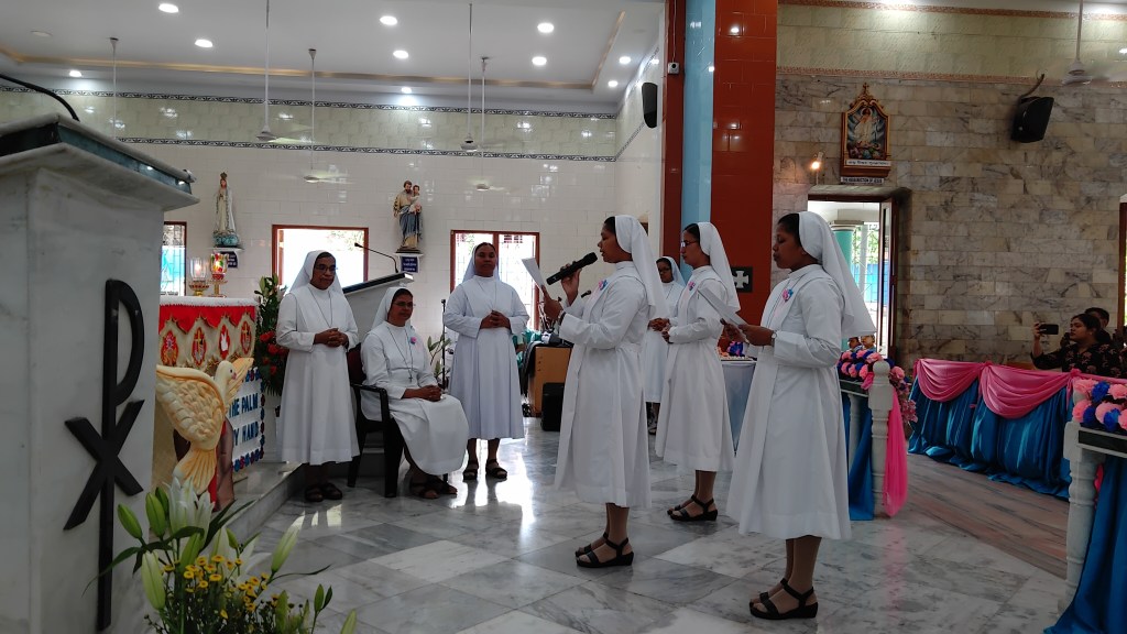 DUM DUM: The perpetual profession of Sr. Ba-I-Thiang Sten, Sr. Binita Bara and Sr. Shashikanta Xalxo was held on 26 May 2024 at St. Patrick’s Church Dum Dum on the solemnity of the Most Holy Trinity. Most Rev Thomas D’ Souza, the Archbishop of Calcutta officiated the Holy Eucharist along with eight Con-Celebrants. The theme of this celebration was taken from Isaiah 49:5 “I have carved you in the palm of my hand.” The Holy Mass commenced with an entrance dance led by the candidates. It was an incredibly inspiring and touching moment when their parents handed the would-be perpetuals to the provincial Rev. Sr. Leelamma Palliparambil FMA. She, in turn, offered them to the Lord.