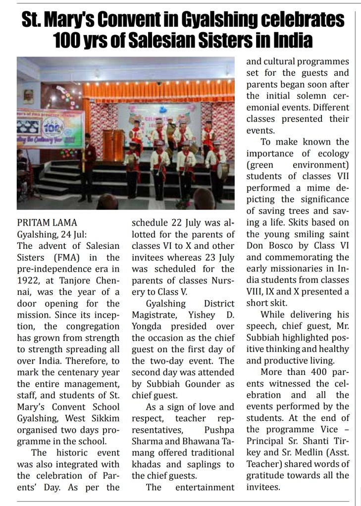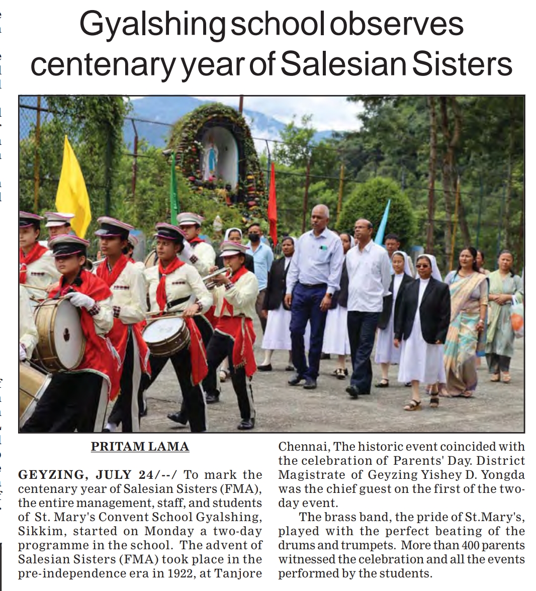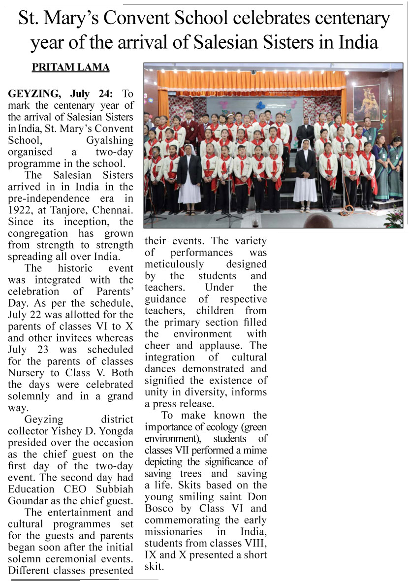 GEYZING: July 23, 2022: The advent of Salesian Sisters in the pre-independence era in 1922, at Tanjore Chennai, indeed was the year of a door opening for the mission. Since its inception, the congregation has grown from strength to strength spreading all over India. Therefore, the celebration to mark the centenary year the School Management, Staff, and Students of St. Mary’s Convent School Geyzing, West Sikkim organized two days program in the School.