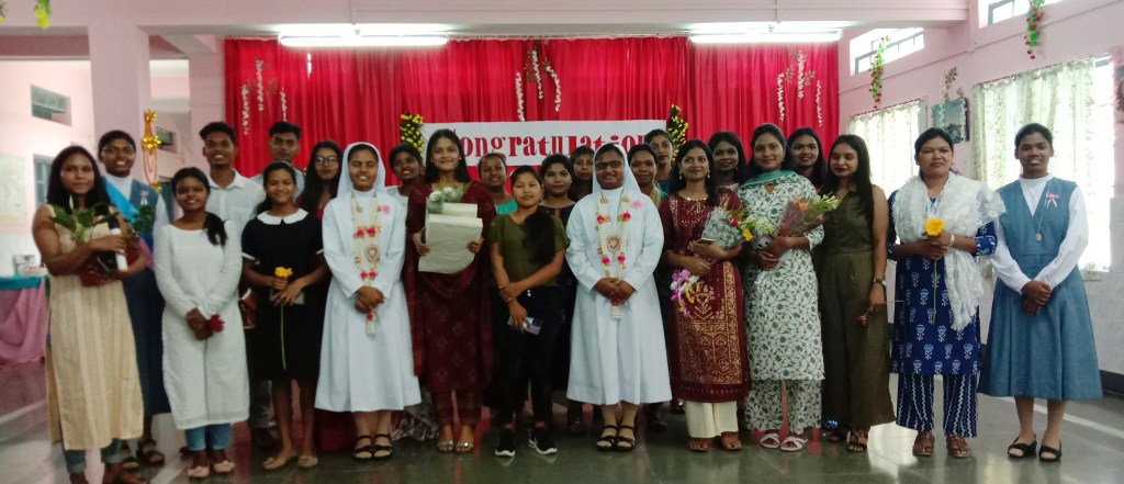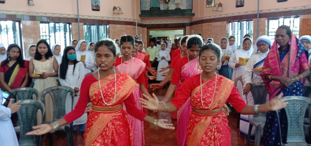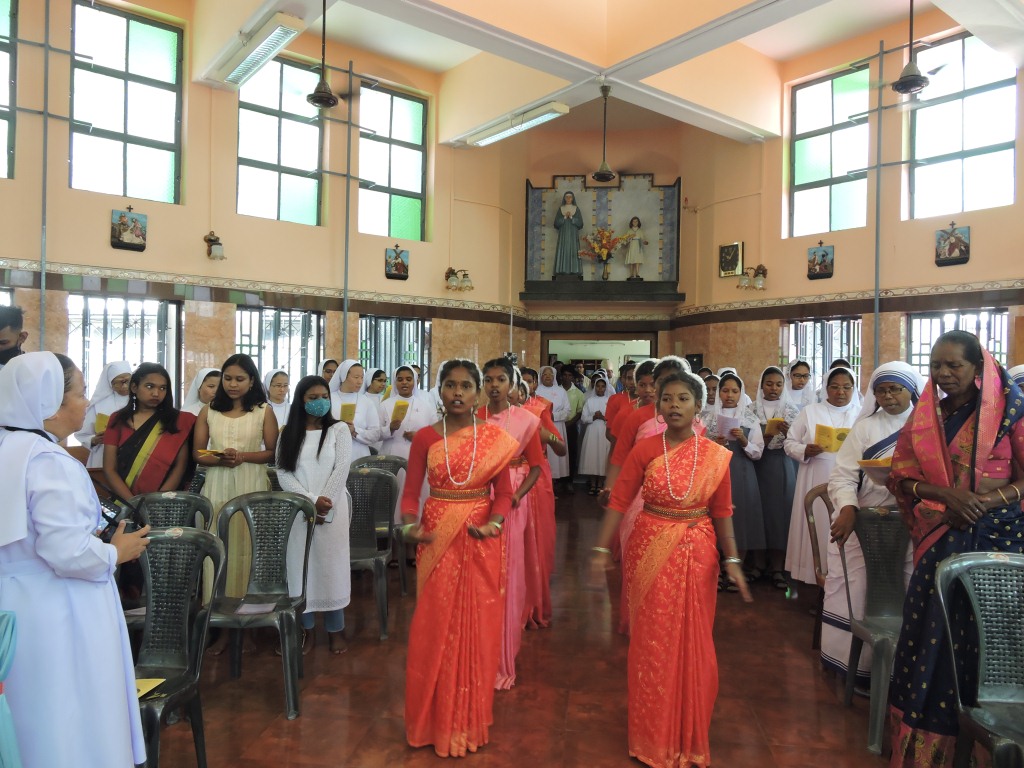 The Holy Mass was celebrated by Most Rev. Vincent Aind, of the Archdiocese of Ranchi, who delivered a heartfelt homily highlighting the importance of Religious life. He spoke of the Divine calling to serve God, who called us before the foundation of the world, consecrated and set us apart, to proclaim good news to others. He mostly emphasised Isaiah 61:1‘The Lord God has put his Spirit in me, because the Lord has appointed me to tell the good news to the poor. He has sent me to comfort those whose hearts are broken, to tell the captives they are free, and to tell the prisoners they are released. The Archbishop’s word deeply resonated with the newly professed sisters as they made their first Vows, embracing a life of sacrifice, commitment and devotion. The liturgical celebration was further enhanced by a beautiful choir, led by the past pupils of Mazzarello Convent School, whose hymns of praise filled the air with joy, reflecting the sacredness of this momentous occasion. Following the Mass, the sisters were presented with tokens of love and appreciation. The sisters, Novices, ADMA members and the parents of newly professed Sisters added colour to the celebration by singing festive songs and dances to make it a more memorable event.