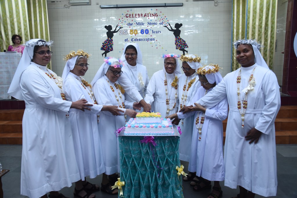 The Daughters of Mary Help of Christians popularly known as the Salesian Sisters of Don Bosco have marked two great events in the history of the Institute i.e. the 150th anniversary of the foundation of the Institute and the centenary of the arrival of the pioneers in India. Million thanks to the Pioneers who sowed the seed of vocation in our country. The fruit of their hard work was celebrated on 06 October 2022 in the Province of Kolkata at Auxilium Provincial House, Dum Dum as we celebrated the jubilee of the religious profession of our sisters. With great joy celebrated and thanked God for the life of fidelity and dedication lived by our dear sisters, Sr.Elizabeth Makil and Sr.Silvina Kujur for 60 years, Sr.Rose Ezarath, Sr.Teresa Korattiparampil, Sr.Dorothy Torcato, and Sr.Teresa Thudianplackal for 50 years, Sr.Minimol Chettayil and Sr.Taramani Minj for 25 years.