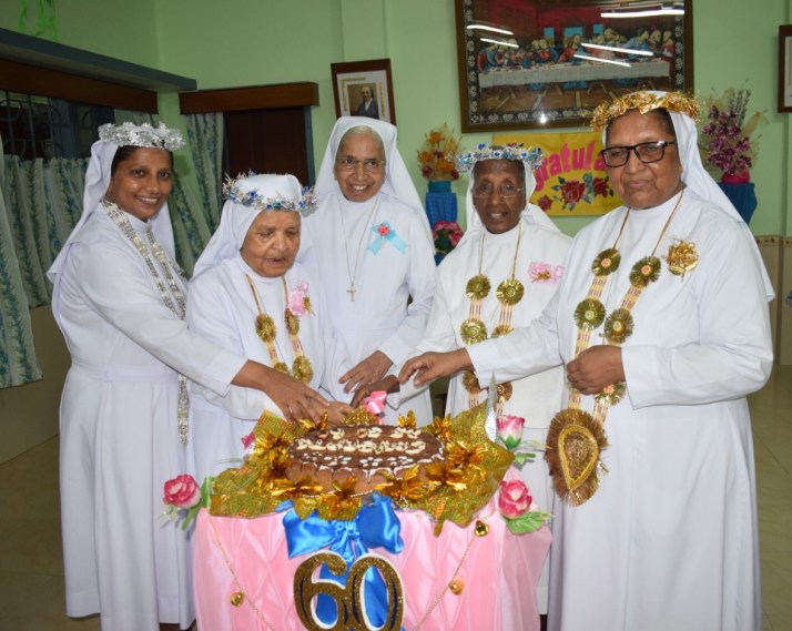 In the refectory, the Jubilarians were again felicitated with the cutting of the jubilee cake. Sisters and House Staff congratulated them with their melodious songs. Sr. Provincial gifted them with a statute of Mary and other gifts and the different communities presented various gifts. The celebration ended with a fellowship meal. At the end of which the Jubilarians expressed their overflowing joy and thanked the Lord and all those who made their day a memorable one.