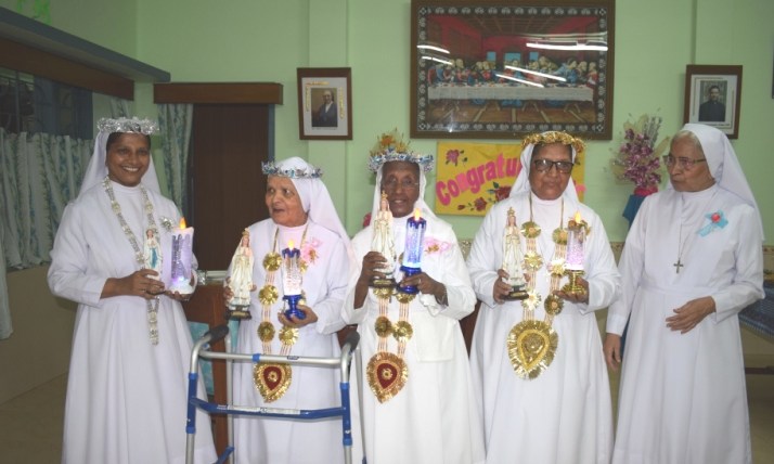 After the homily the Jubilarians renewed their Religious Profession followed by a solemn felicitation with a garland by Sr. Rose Ezarath our Provincial. The prayer of the faithful was solemnly sung by Sr. Emilia Vas. After the communion, the jubilarians were crowned after the singing of “Veni Sponsa Christi” (come Bride of Christ). Later followed the photo session of the Jubilarians in front of the beautifully decorated altar.