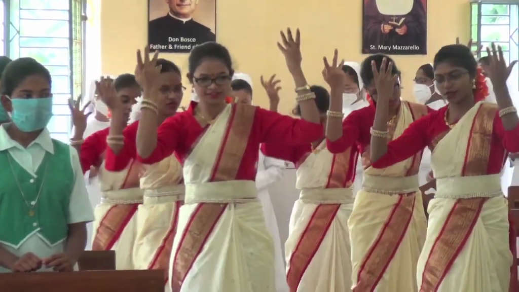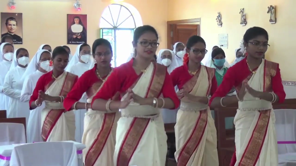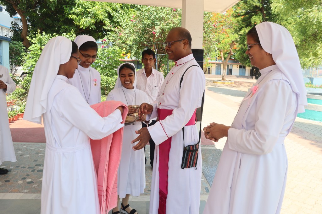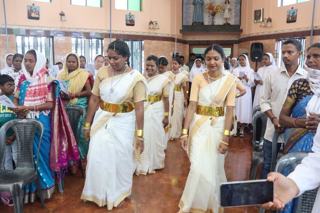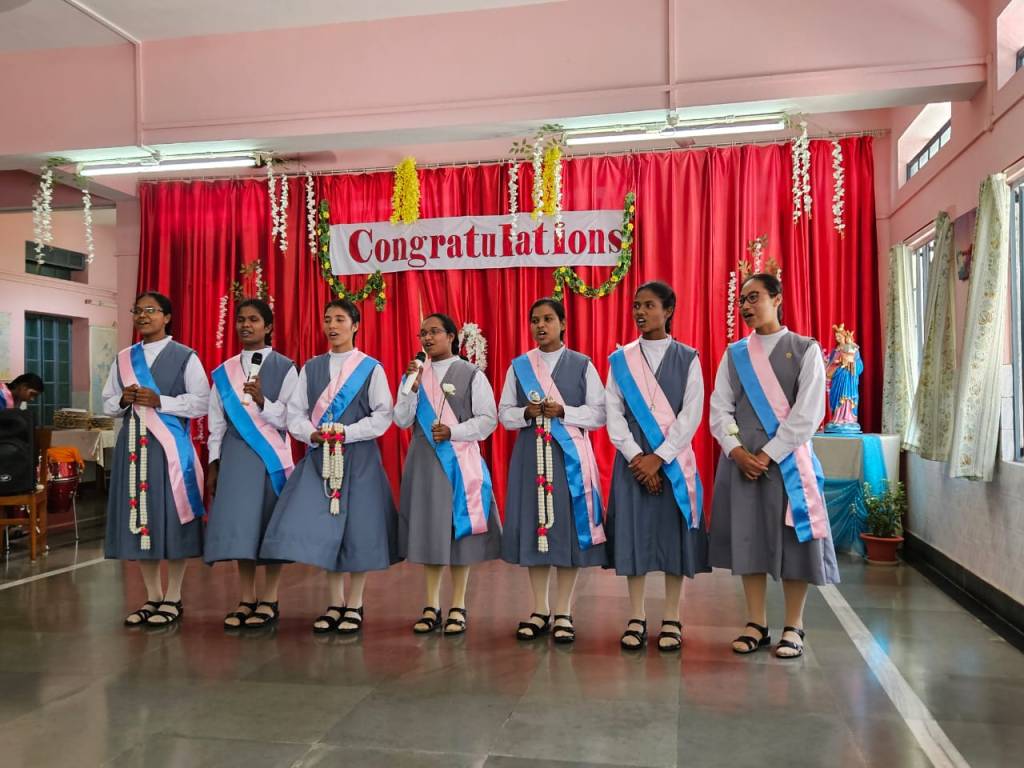 The Holy Mass was celebrated by Most Rev. Vincent Aind, of the Archdiocese of Ranchi, who delivered a heartfelt homily highlighting the importance of Religious life. He spoke of the Divine calling to serve God, who called us before the foundation of the world, consecrated and set us apart, to proclaim good news to others. He mostly emphasised Isaiah 61:1‘The Lord God has put his Spirit in me, because the Lord has appointed me to tell the good news to the poor. He has sent me to comfort those whose hearts are broken, to tell the captives they are free, and to tell the prisoners they are released. The Archbishop’s word deeply resonated with the newly professed sisters as they made their first Vows, embracing a life of sacrifice, commitment and devotion. The liturgical celebration was further enhanced by a beautiful choir, led by the past pupils of Mazzarello Convent School, whose hymns of praise filled the air with joy, reflecting the sacredness of this momentous occasion. Following the Mass, the sisters were presented with tokens of love and appreciation. The sisters, Novices, ADMA members and the parents of newly professed Sisters added colour to the celebration by singing festive songs and dances to make it a more memorable event.