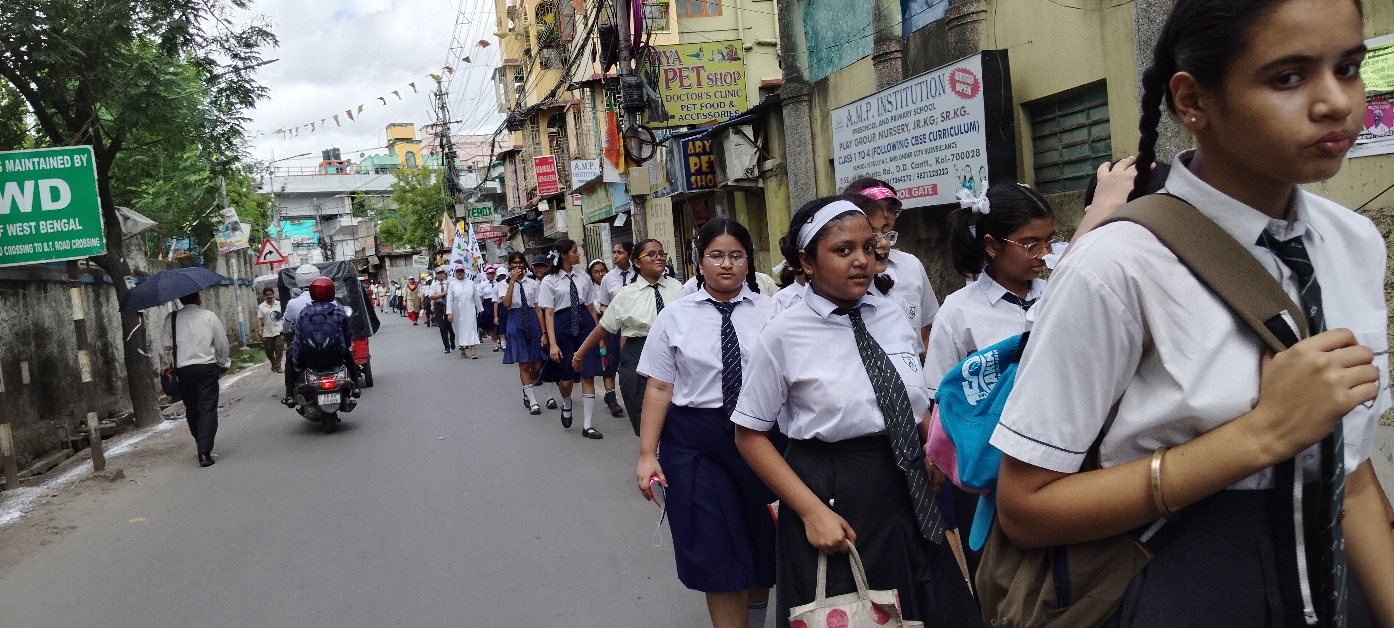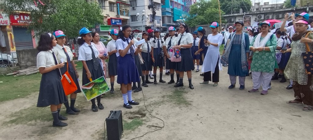 Group 3, covered the street starting from P.K Guha Road, Debonair restaurant, and SBI bank and reached Jessop Gate. On the way, students shouted out slogans like ‘Save earth, save humanity’, ‘Go green, live green’, ‘Keep our earth green and clean’, Use dustbin’, ‘Keep the city clean’. The importance of protecting the environment was conveyed to everyone and the students while moving towards NC Mitra Road also spread awareness about the usefulness of water. Then the force moved to the Post Office Road, where the locals were motivated to foster social responsibility.