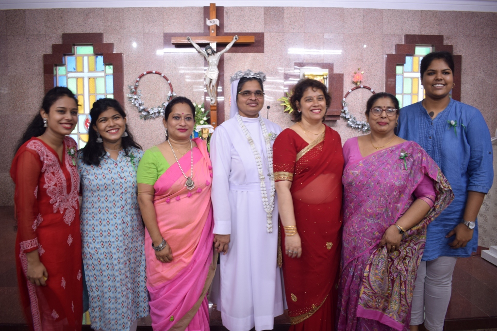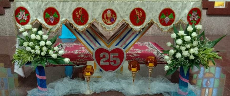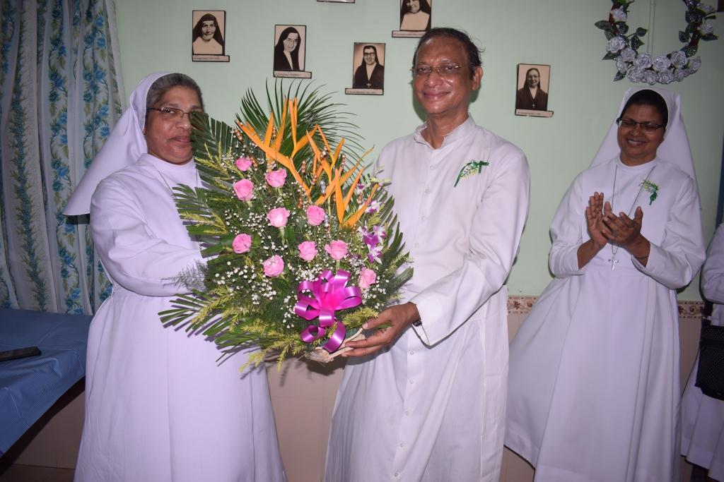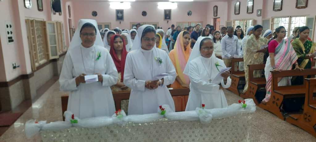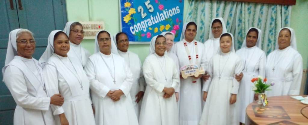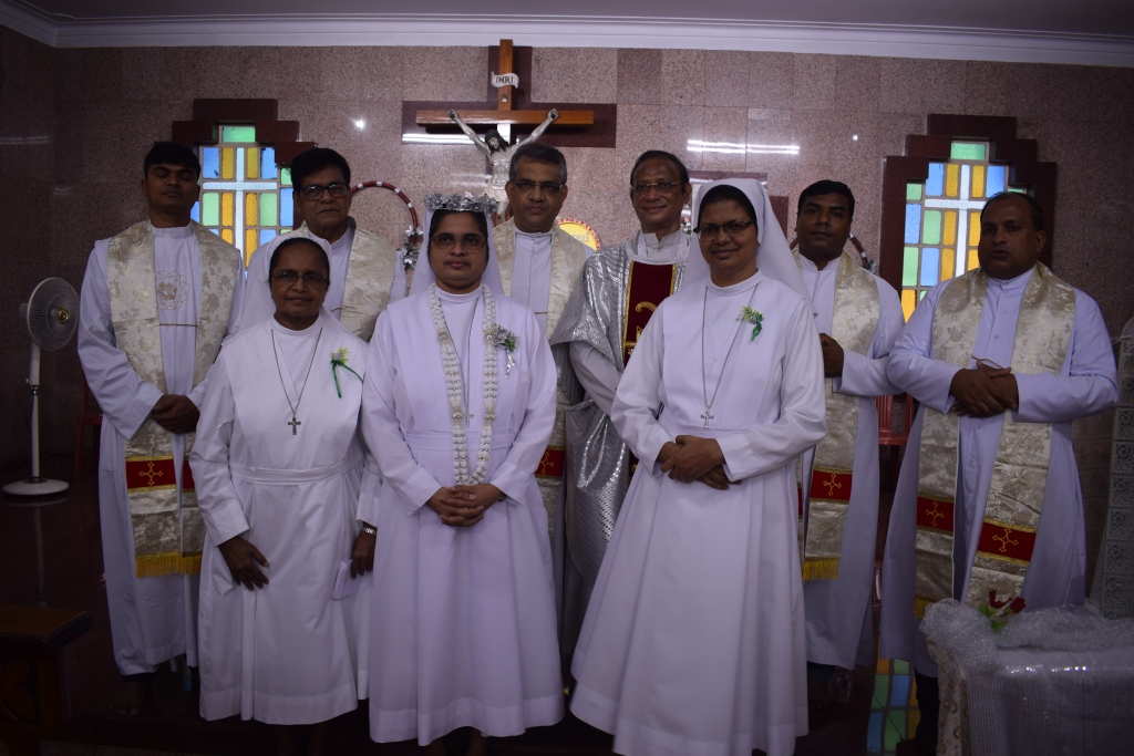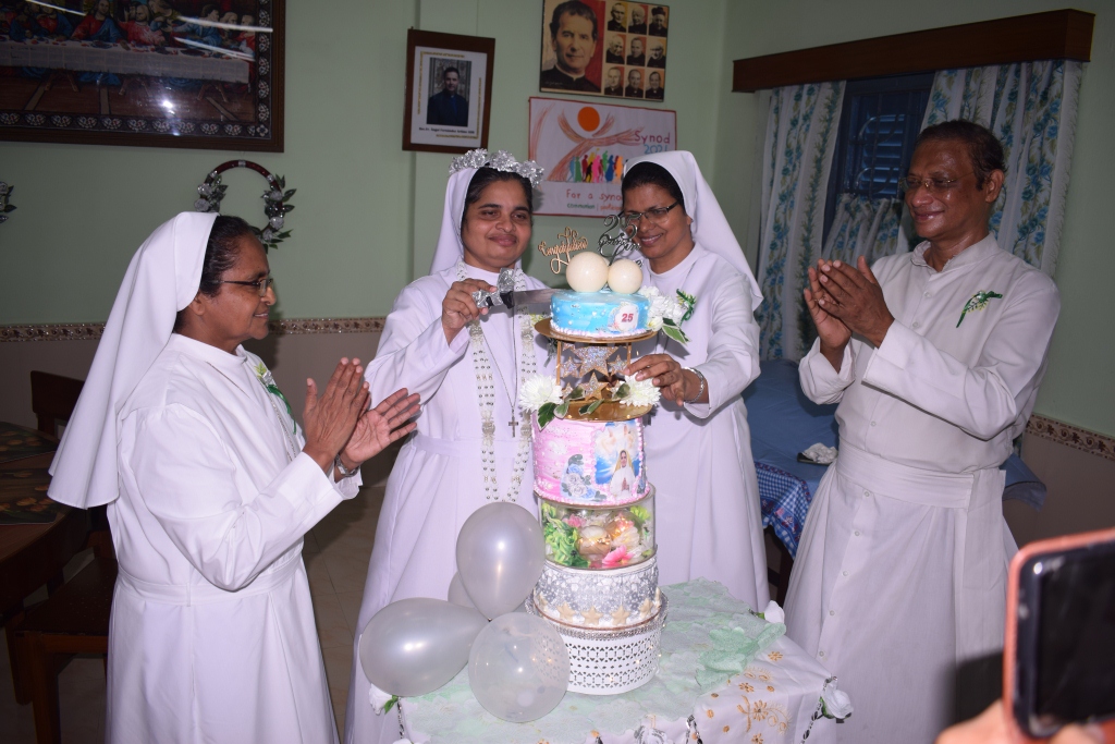 On 30th May, 2022, the Community of Auxilium – Dum Dum celebrated the Silver Jubilee of the Religious Profession of Sr. Minimol Chettayil FMA, the Provincial Secretary. The community rejoiced with her for the wonders God has accomplished in and through her. The beautiful white roses in the chapel with their silver lining and the wreathes hanging in the dining room- all creative ideas of our dear Sr. Stella gave an exuberant welcome to all the guests. The celebration began with a Solemn Holy Eucharist at 11 a.m. Rev. Fr. Dominic Gomes, Vicar General of the Archdiocese of Kolkata along with Rev. Fr. I.C. Jacob SDB, Provincial Secretary, and four other concelebrants officiated the Holy Eucharist. The entrance dance by the young Catholic girls of our school with their rhythmic steps ushered the celebrants, the jubilarian, Provincial and Sr. Stella to the altar. After a short introduction to the celebration the Jubilee bells chimed. The presence of many sisters of our neighbouring communities, Salesian Family members, SMI, MC Brothers and sisters, Ursuline Sister, Past Pupils, teachers and youth made this event a grace filled and joyful one for our jubilarian. The main celebrant Rev. Fr. Dominic Gomes in his homily highlighted the Bible quotation “Be not afraid, I go before you always…” the persistent phrase of Sr. Minimol in her 25 years which led her through. He assured that the Lord truly walks ahead of every event and every situation in our life and brings us out into safety and crowns it all with success. On this great occasion Sr. Minimol renewed her religious vows before the community and was felicitated with a garland by Sr. Provincial and adorned with a Silver Crown by the celebrant Rev. Fr. Dominic Gomes. After the Eucharistic celebration Sr. Minimol expressed words of gratitude to the celebrants and all well-wishers for their presence and the support of every one’s prayers. Everyone then proceeded to the dining hall where the Jubilarian was felicitated and congratulated with songs and dances and concluded with a sumptuous meal well served. This day will be remembered as a unique one by the Jubilarian and by all who cherish it.