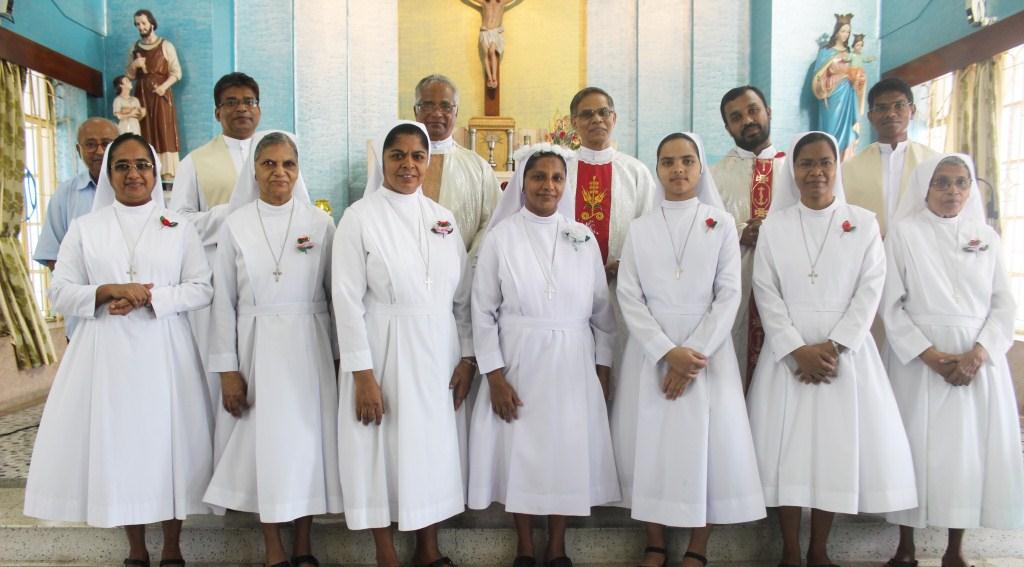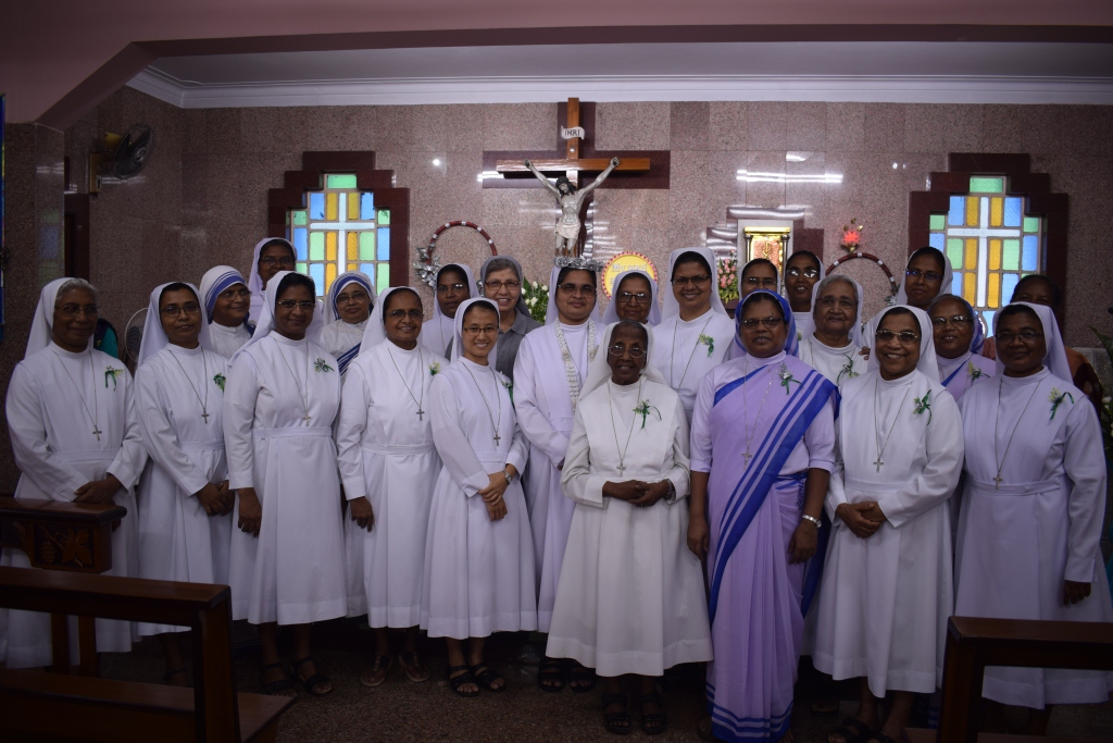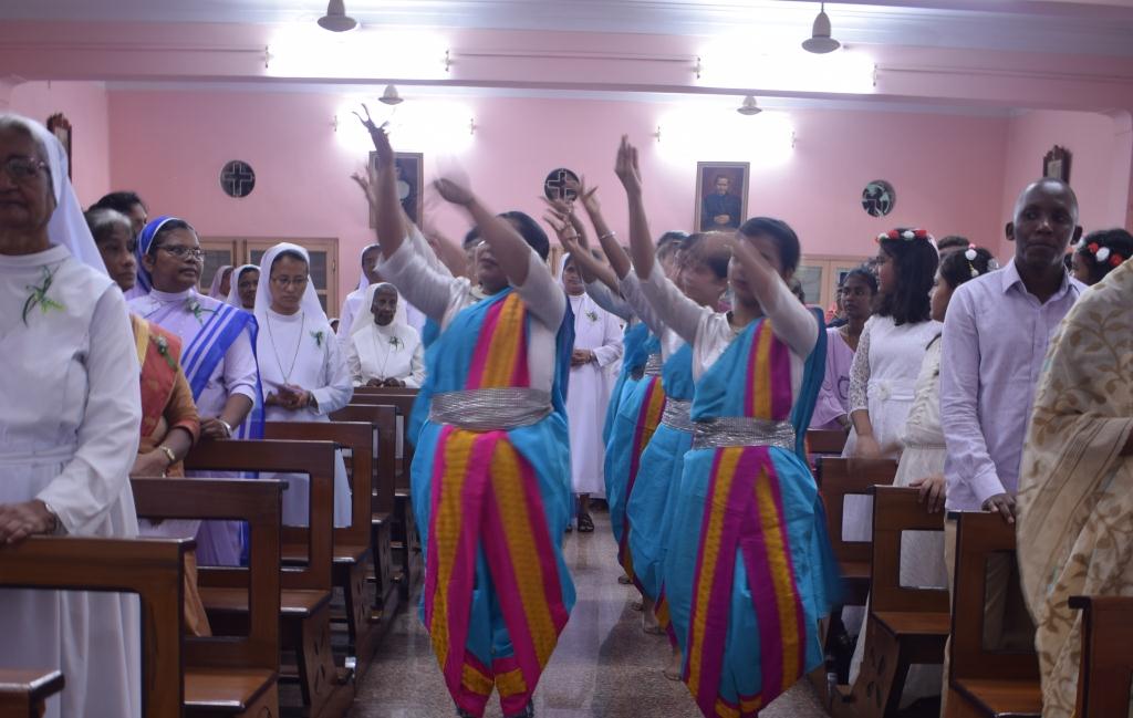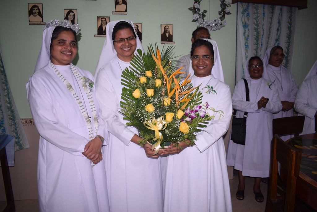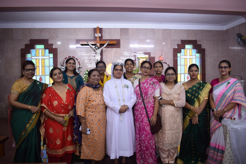 On 30th May, 2022, the Community of Auxilium – Dum Dum celebrated the Silver Jubilee of the Religious Profession of Sr. Minimol Chettayil FMA, the Provincial Secretary. The community rejoiced with her for the wonders God has accomplished in and through her. The beautiful white roses in the chapel with their silver lining and the wreathes hanging in the dining room- all creative ideas of our dear Sr. Stella gave an exuberant welcome to all the guests. The celebration began with a Solemn Holy Eucharist at 11 a.m. Rev. Fr. Dominic Gomes, Vicar General of the Archdiocese of Kolkata along with Rev. Fr. I.C. Jacob SDB, Provincial Secretary, and four other concelebrants officiated the Holy Eucharist. The entrance dance by the young Catholic girls of our school with their rhythmic steps ushered the celebrants, the jubilarian, Provincial and Sr. Stella to the altar. After a short introduction to the celebration the Jubilee bells chimed. The presence of many sisters of our neighbouring communities, Salesian Family members, SMI, MC Brothers and sisters, Ursuline Sister, Past Pupils, teachers and youth made this event a grace filled and joyful one for our jubilarian. The main celebrant Rev. Fr. Dominic Gomes in his homily highlighted the Bible quotation “Be not afraid, I go before you always…” the persistent phrase of Sr. Minimol in her 25 years which led her through. He assured that the Lord truly walks ahead of every event and every situation in our life and brings us out into safety and crowns it all with success. On this great occasion Sr. Minimol renewed her religious vows before the community and was felicitated with a garland by Sr. Provincial and adorned with a Silver Crown by the celebrant Rev. Fr. Dominic Gomes. After the Eucharistic celebration Sr. Minimol expressed words of gratitude to the celebrants and all well-wishers for their presence and the support of every one’s prayers. Everyone then proceeded to the dining hall where the Jubilarian was felicitated and congratulated with songs and dances and concluded with a sumptuous meal well served. This day will be remembered as a unique one by the Jubilarian and by all who cherish it.