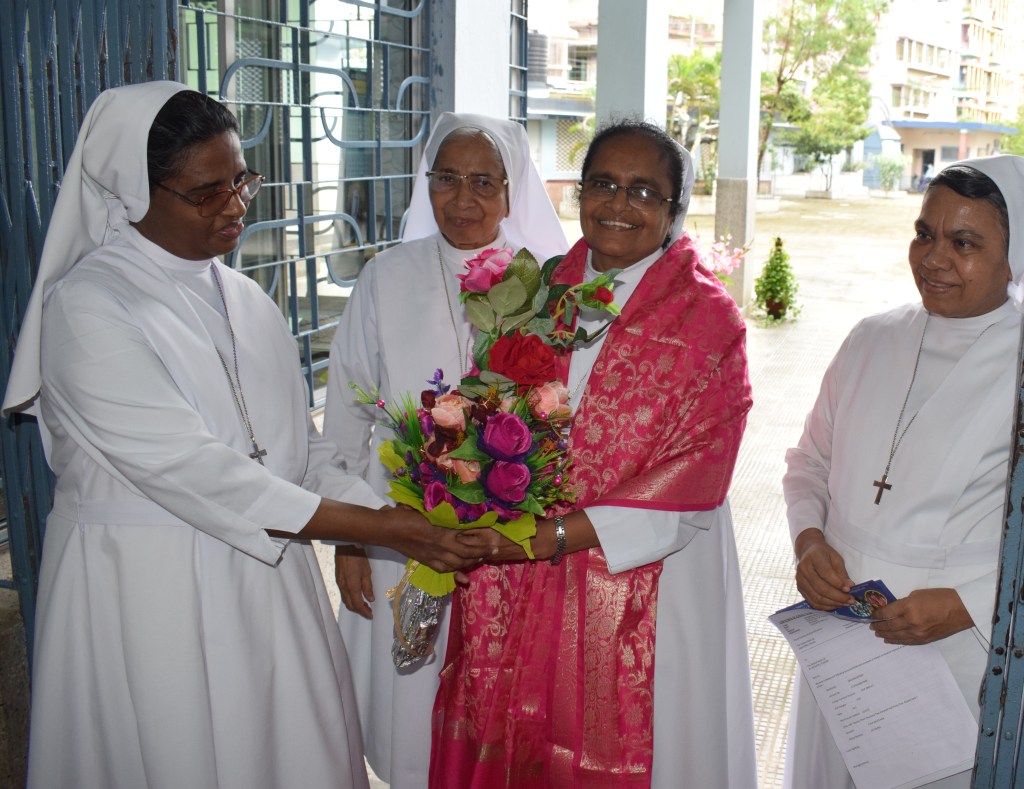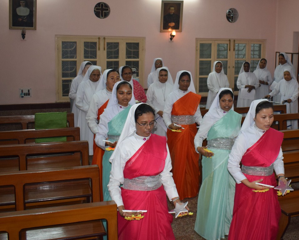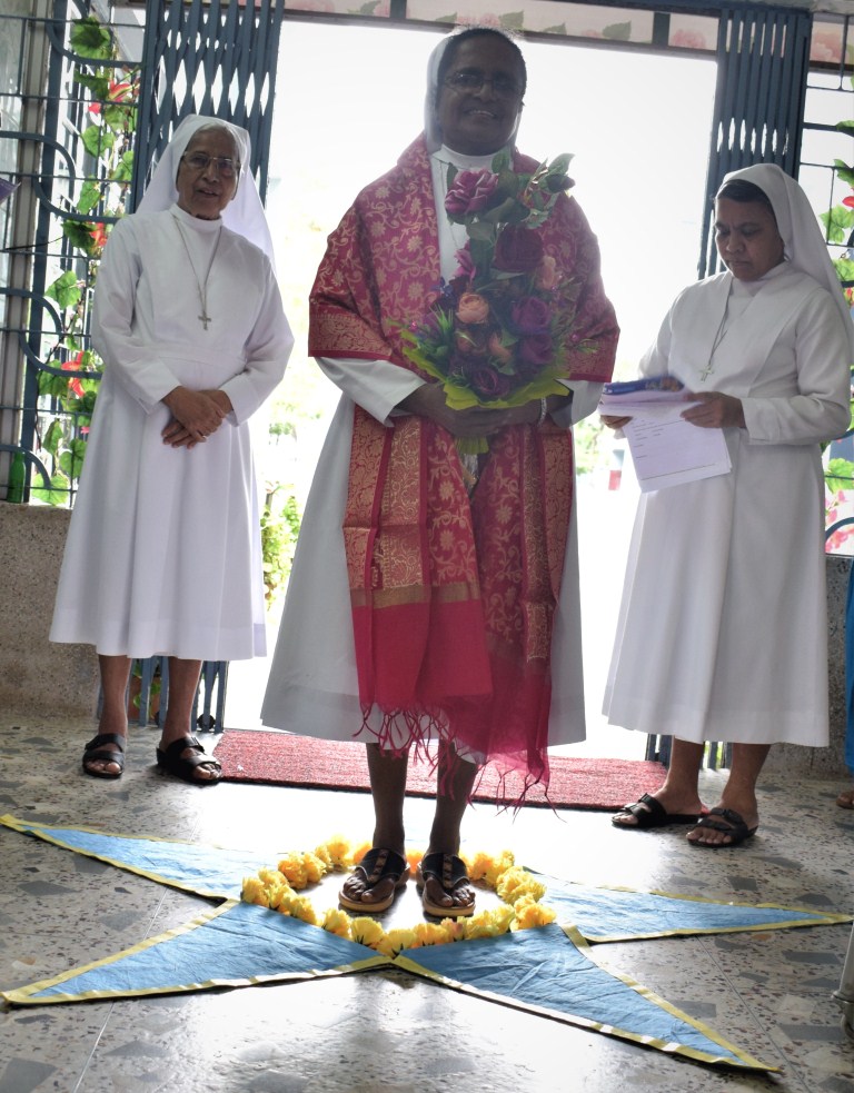 The community of Auxilium Dum Dum kept themselves busy preparing for the arrival of new animator. Day after day and week after week the preparation went on till it occurred. Finally on 17th August 2020, we had the joy of welcoming our new animator in the person of Sr. Stella Potteparambil, coming from Auxilium Barasat. The community gave her a solemn welcome at 4.00 p.m. At the entrance of the house a star symbolizing her name, was solemnly placed. Sr. Stella stood in the middle of the star while the significance of this meaningful star was interpreted. The star that illumine the path, that points out towards holiness, the symbol of a leader who directs and the symbol of one who mentors and facilitates. After expressing these virtues of the animator Sr. Stella, was given a star shaped lamp in her hands. She was then accompanied by the Sisters with their rhythmic steps to the altar. Prayer of intercessions for our new animator was animated by Sr. Emilia Vas responding: This is our prayer today may the Lord guide and pave your way…The House Staff concluded these intercessions by the Hail Mary sung in Hindi. The new animator was led to the refectory where the community Sisters sang a welcome song of gladness, everything was geared around the shining stars. The House Staff added to the joy by their melodious rhythmic welcome song and all had sumptuous tea and snacks.
